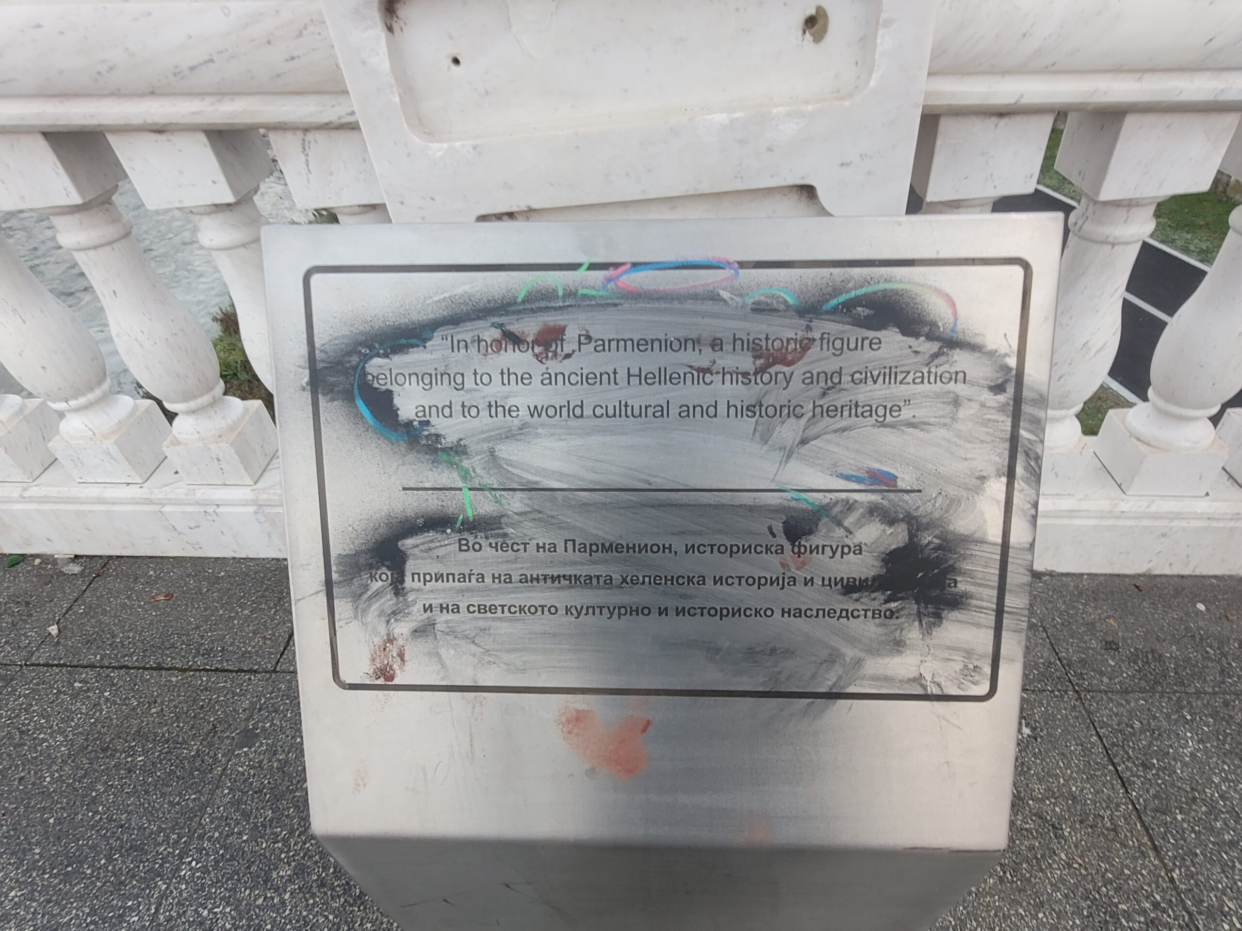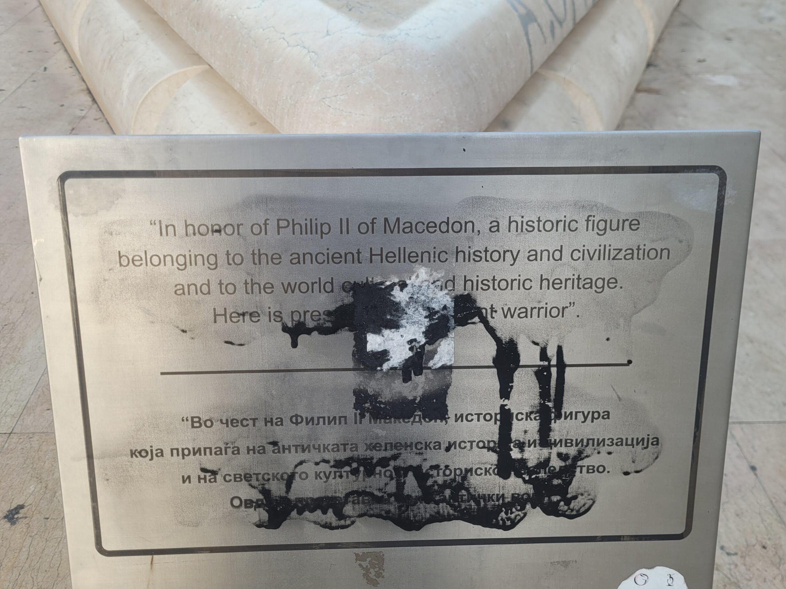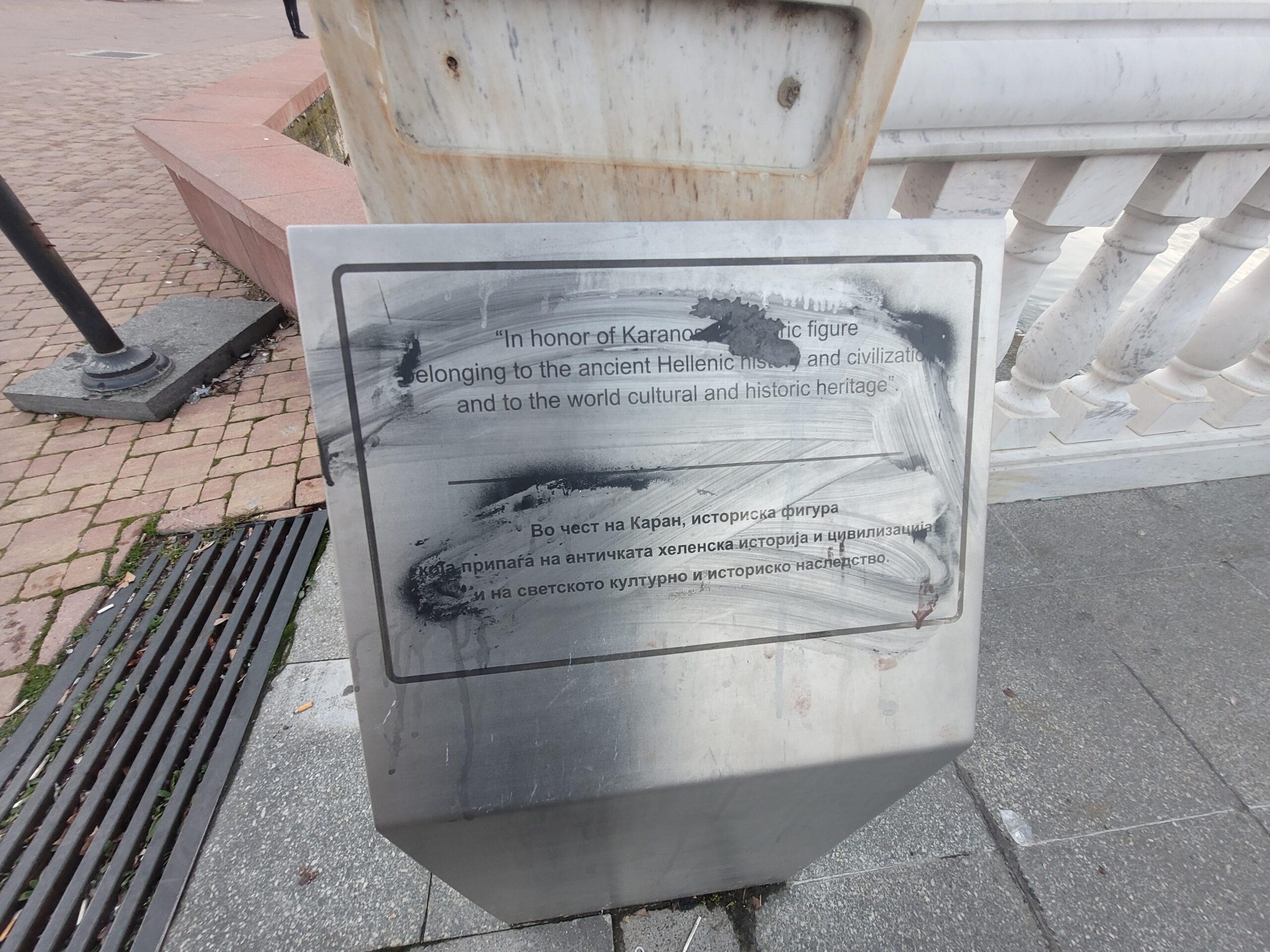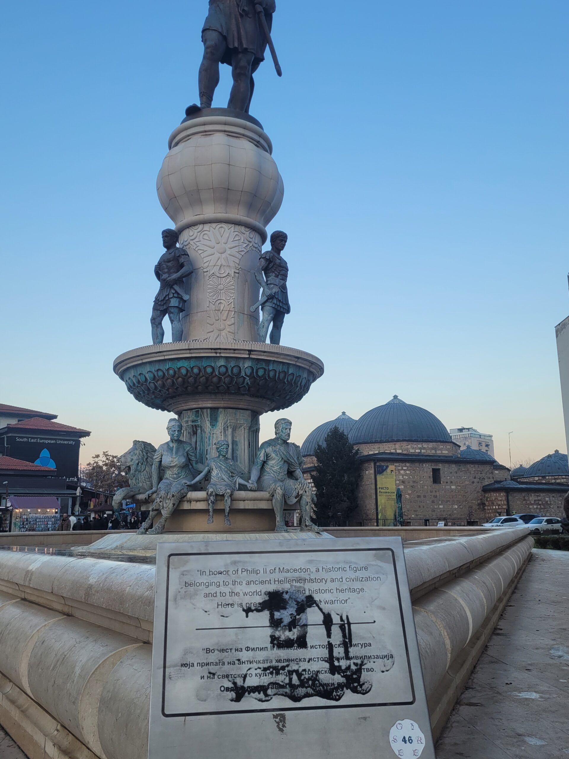 Στο άγαλμα του Μεγάλου Αλεξάνδρου που βρίσκεται στο κέντρο της πλατείας της «Μακεδονίας» (Φωτογραφίες 12-14), στο άγαλμα του Φίλιππου (Φωτογραφίες 15-17) που βρίσκεται στην ακριβώς απέναντι πλατεία, στην είσοδο της παλιάς πόλης, καθώς επίσης και στο συντριβάνι, που δείχνει τη ζωή της μητέρας του Αλέξανδρου της Ολυμπιάδας (Φωτογραφίες 18-20), υπάρχουν και εκεί πινακίδες, φυσικά βανδαλισμένες με σβησμένα τα ανάγλυφα γράμματα και δεν έχει γίνει σχεδόν καμία προσπάθεια καθαρισμού. Στο δε άγαλμα του Μεγάλου Αλεξάνδρου όχι μόνο ήταν σβησμένα τα ιστορικά στοιχεία, αλλά είχε στραβώσει κάπως το stand και είχανε κρεμάσει πάνω του σακούλα σκουπιδιών (Φωτογραφία 14) .
