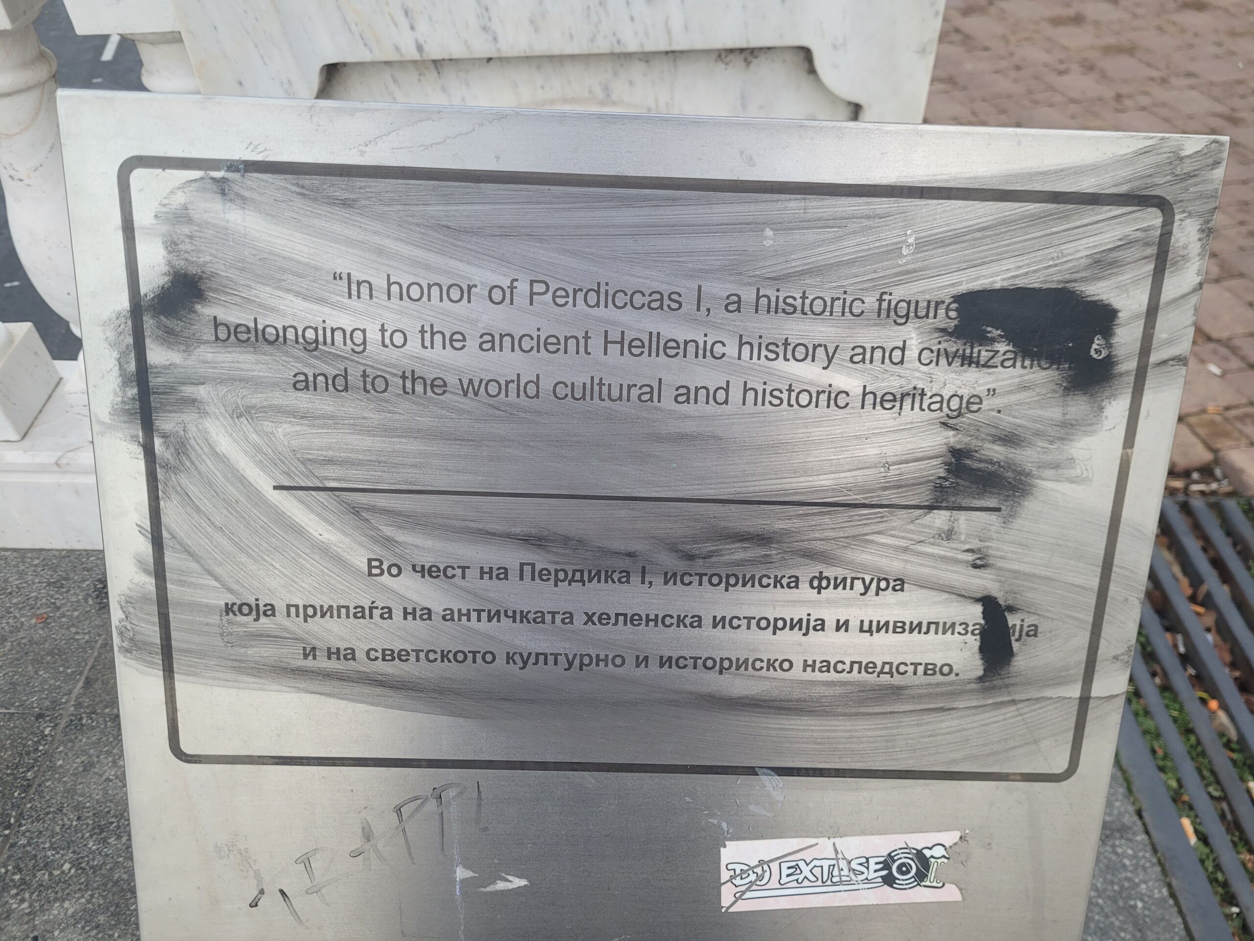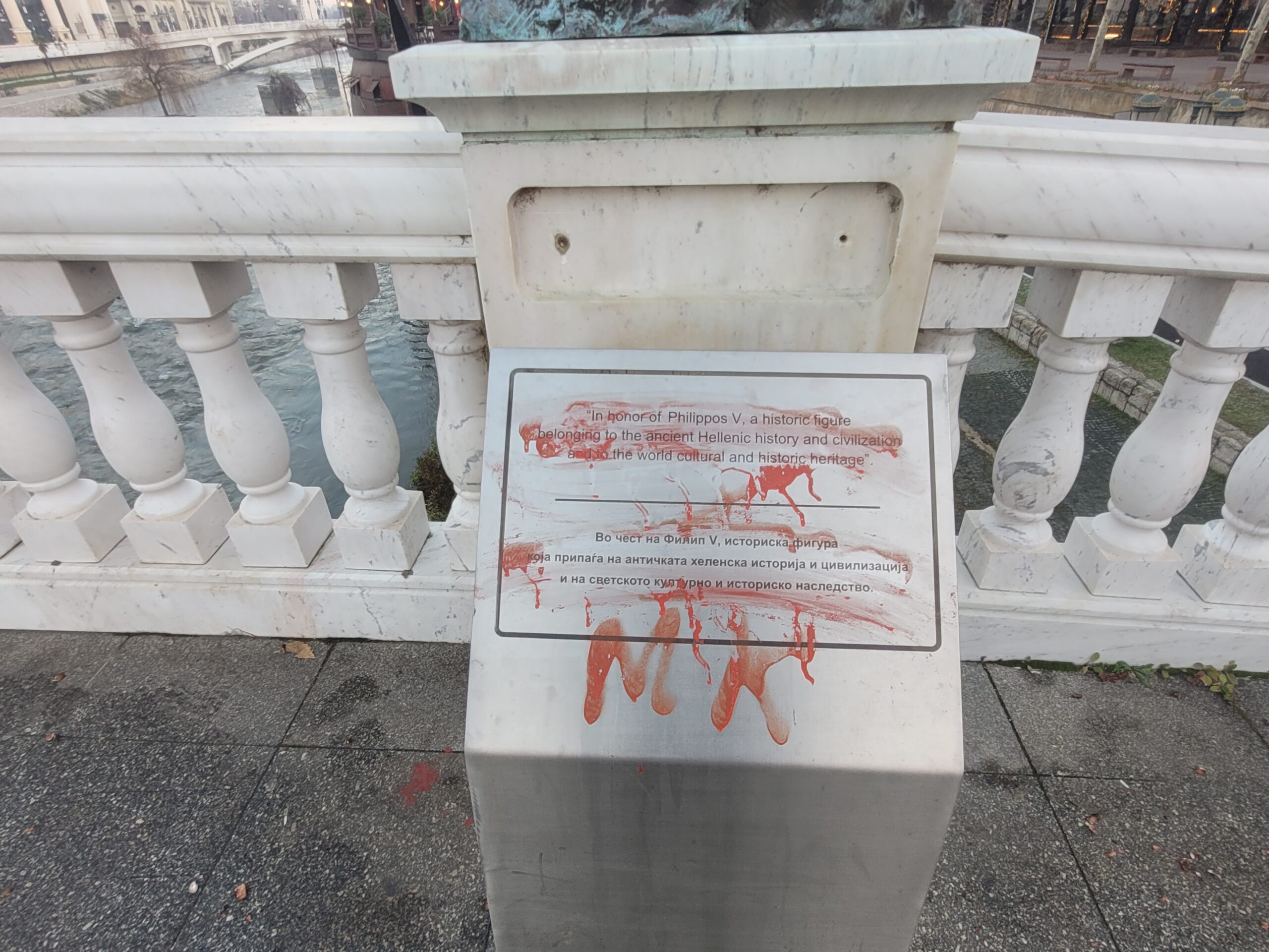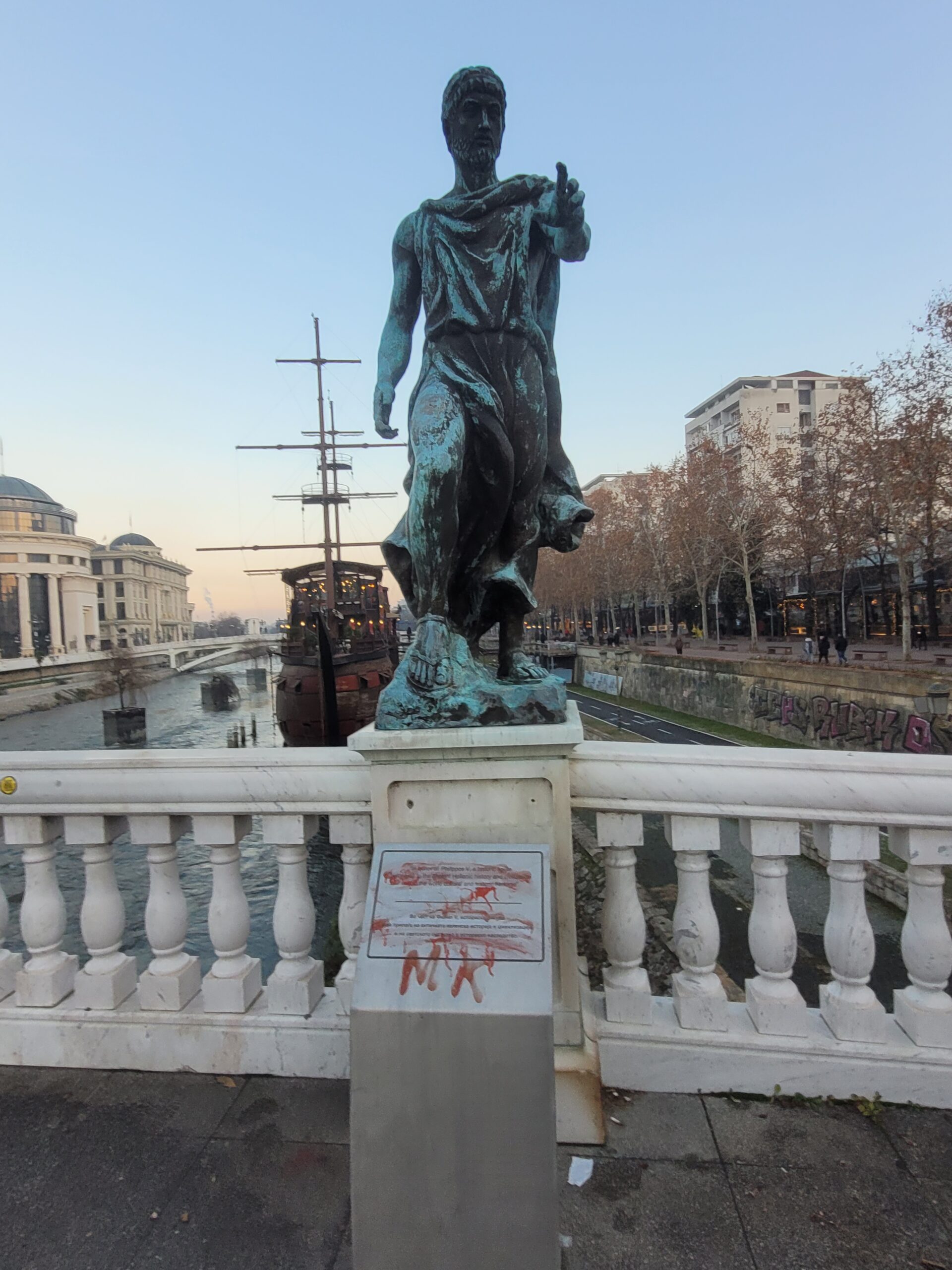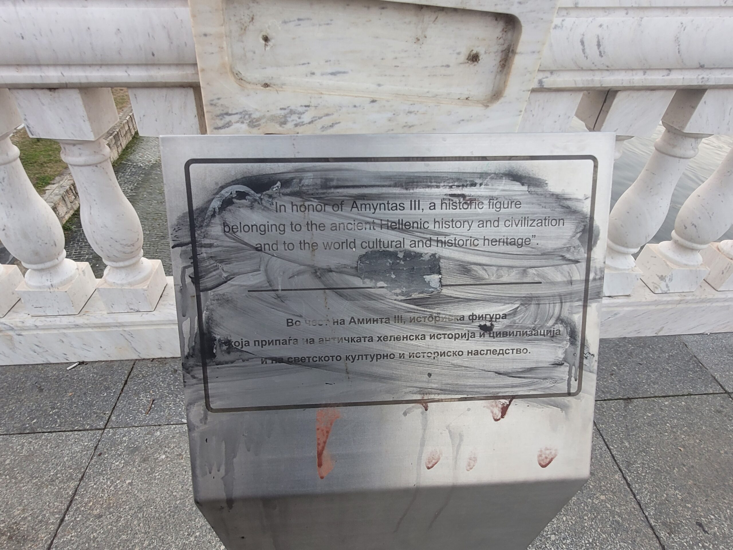 Στο άγαλμα του Μεγάλου Αλεξάνδρου που βρίσκεται στο κέντρο της πλατείας της «Μακεδονίας» (Φωτογραφίες 12-14), στο άγαλμα του Φίλιππου (Φωτογραφίες 15-17) που βρίσκεται στην ακριβώς απέναντι πλατεία, στην είσοδο της παλιάς πόλης, καθώς επίσης και στο συντριβάνι, που δείχνει τη ζωή της μητέρας του Αλέξανδρου της Ολυμπιάδας (Φωτογραφίες 18-20), υπάρχουν και εκεί πινακίδες, φυσικά βανδαλισμένες με σβησμένα τα ανάγλυφα γράμματα και δεν έχει γίνει σχεδόν καμία προσπάθεια καθαρισμού. Στο δε άγαλμα του Μεγάλου Αλεξάνδρου όχι μόνο ήταν σβησμένα τα ιστορικά στοιχεία, αλλά είχε στραβώσει κάπως το stand και είχανε κρεμάσει πάνω του σακούλα σκουπιδιών (Φωτογραφία 14) .