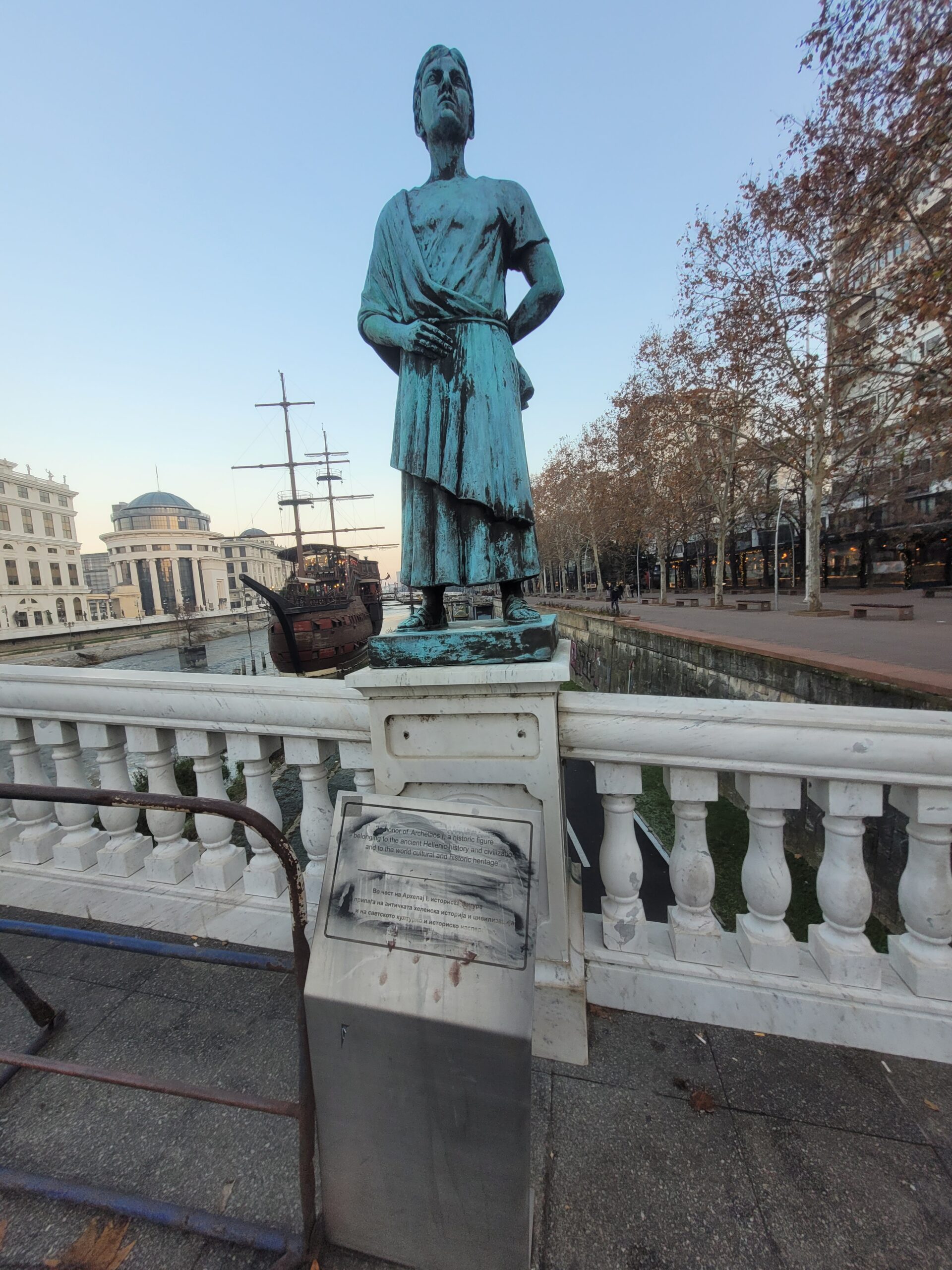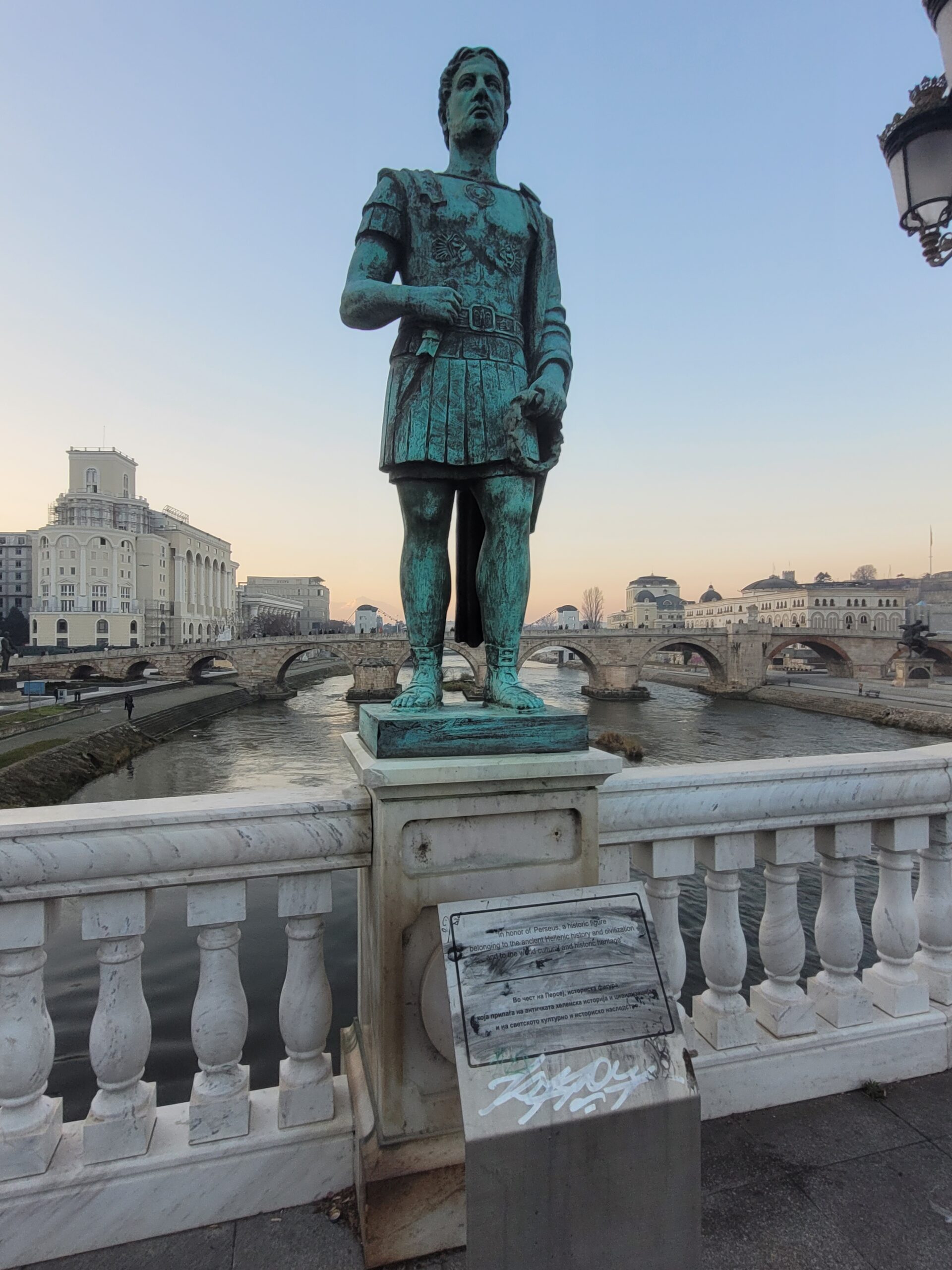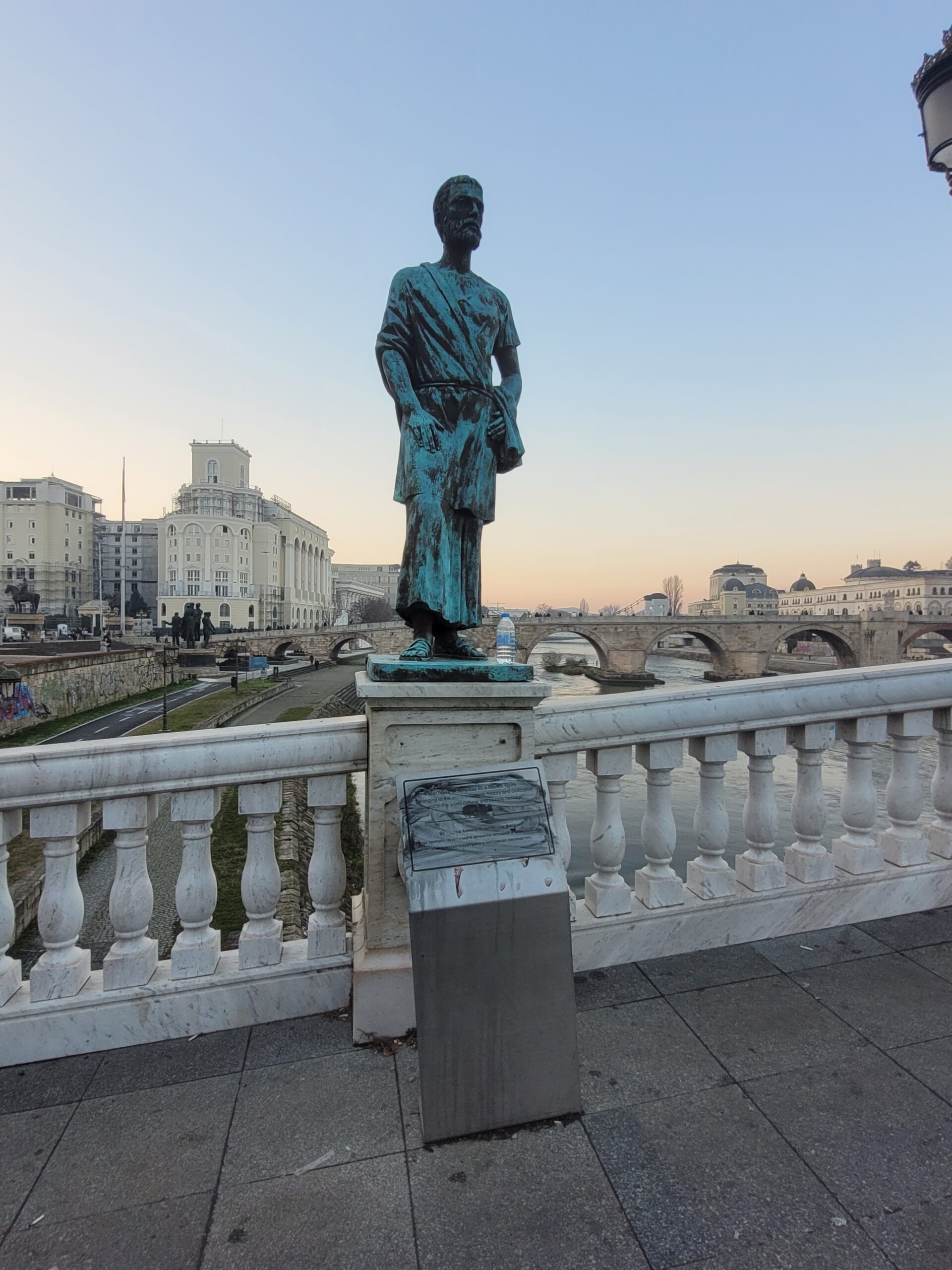 Την πρώτη ημέρα της επίσκεψης μας ο ξεναγός μας πέρασε από την κεντρική πλατεία της πόλης την πλατεία «Μακεδονίας» όπως την λένε στα Σκόπια (Φωτογραφία 1 και 2), και μας έδειξε την γέφυρα με τα αγάλματα (Φωτογραφία 3), καθώς και την πέτρινη γέφυρα που ενώνει τις δύο πλευρές του Αξιού. Δεν θα αναφερθώ στο κιτς της όλης εμφάνισης της περιοχής με τα πολλά και μεγάλα αγάλματα διαφόρων τύπων, τεχνοτροπιών, μεγεθών και υλικών κατασκευής, αλλά θα σταθώ στην σειρά των αγαλμάτων τα οποία βρίσκονται στην γέφυρα που συνδέει την μία όχθη του Αξιού με την άλλη ακριβώς μπροστά από το αρχαιολογικό μουσείο (Φωτογραφία 3). Στην γέφυρα αυτή και ξεκινώντας από την απέναντι όχθη, από εκεί που είναι κτισμένο το αρχαιολογικό μουσείο, τα αγάλματα δείχνουν την ιστορία της περιοχής. Έτσι λοιπόν έχουμε αγάλματα αρχαίων Μακεδόνων όπως του Περδίκα, του Περσέα, του Παρμενίωνα, του Αμύντα του Γ΄, του Φιλίππου του Ε΄, του Αρχελάου του Α΄, του Καράνου, και του Περδίκα του Α΄, Ακολουθούν αγάλματα διαφόρων άλλων της Ρωμαικής εποχής και όσο προχωράμε προς το αρχαιολογικό μουσείο εμφανίζονται αγάλματα νεότερων εποχών χριστιανικής και μεσαιωνικής περιόδου (Φωτογραφίες 4-11).