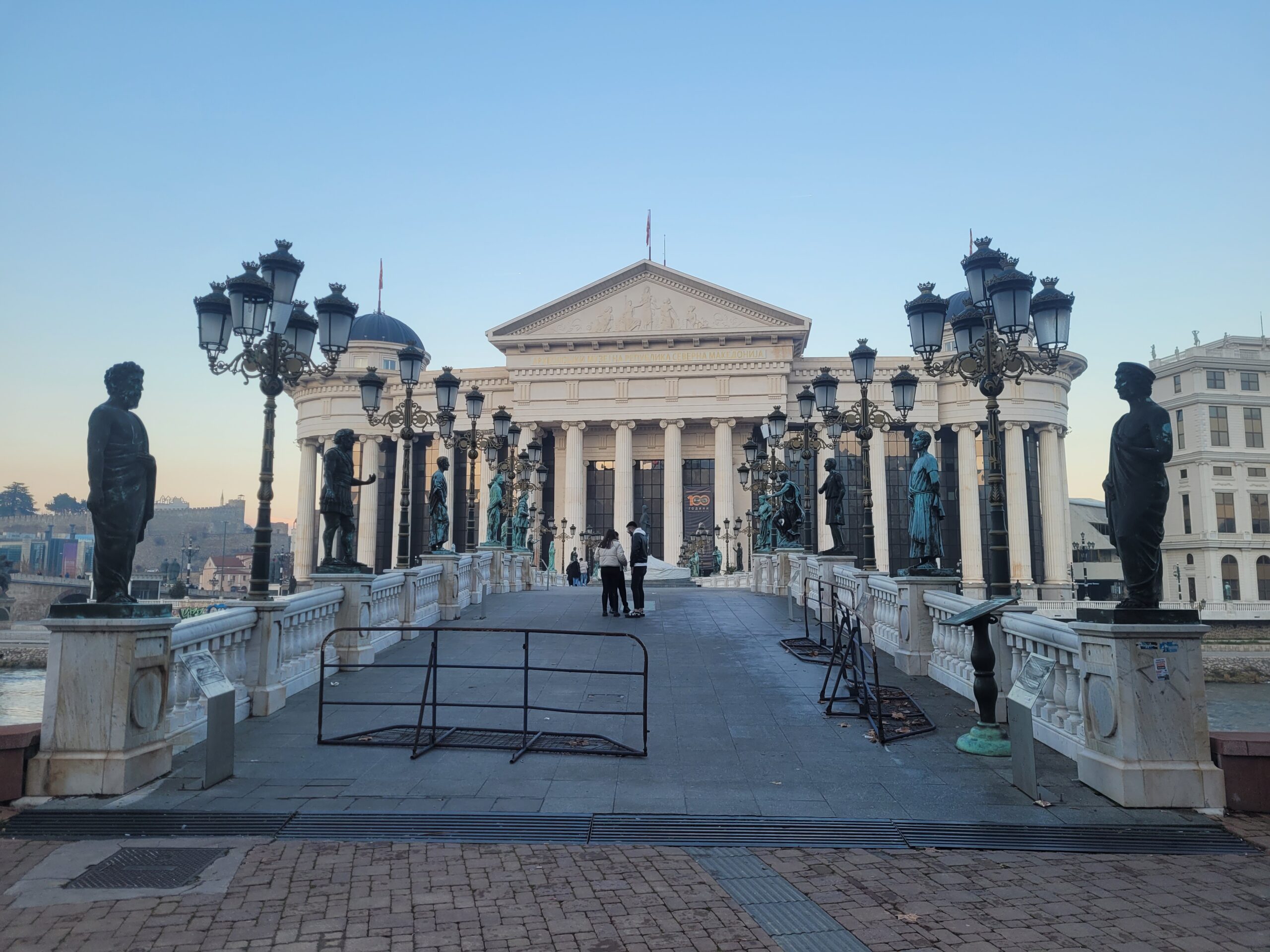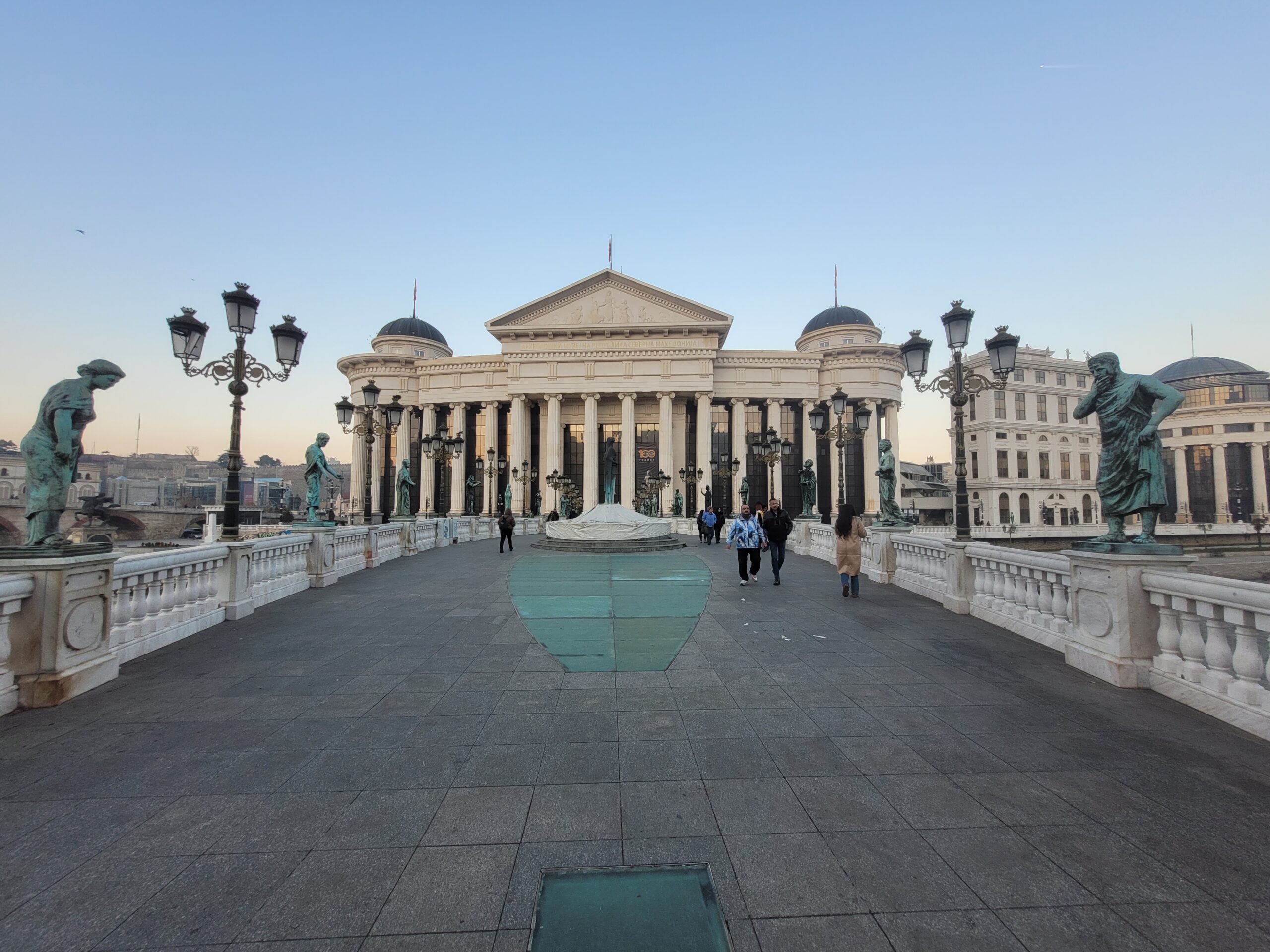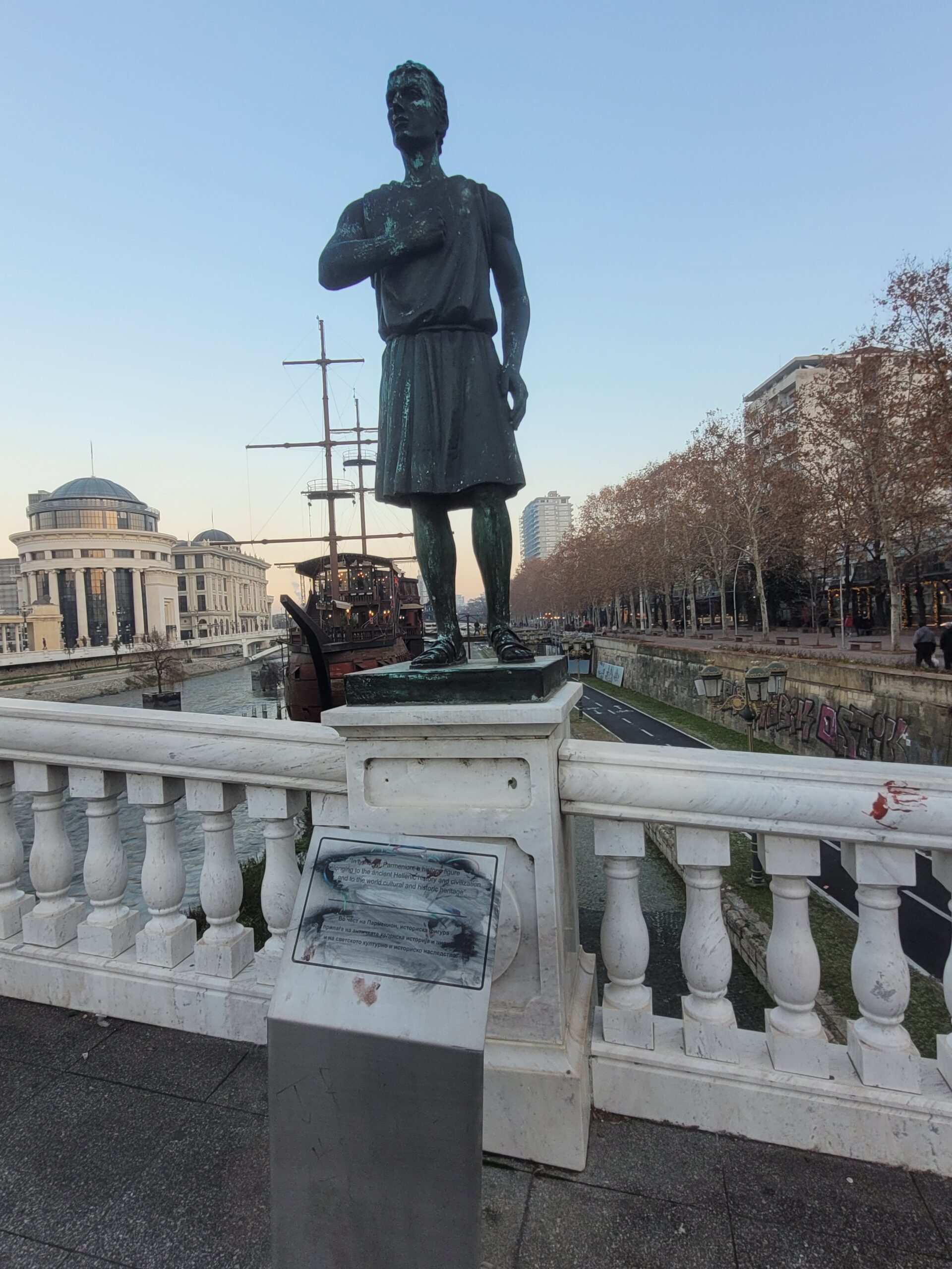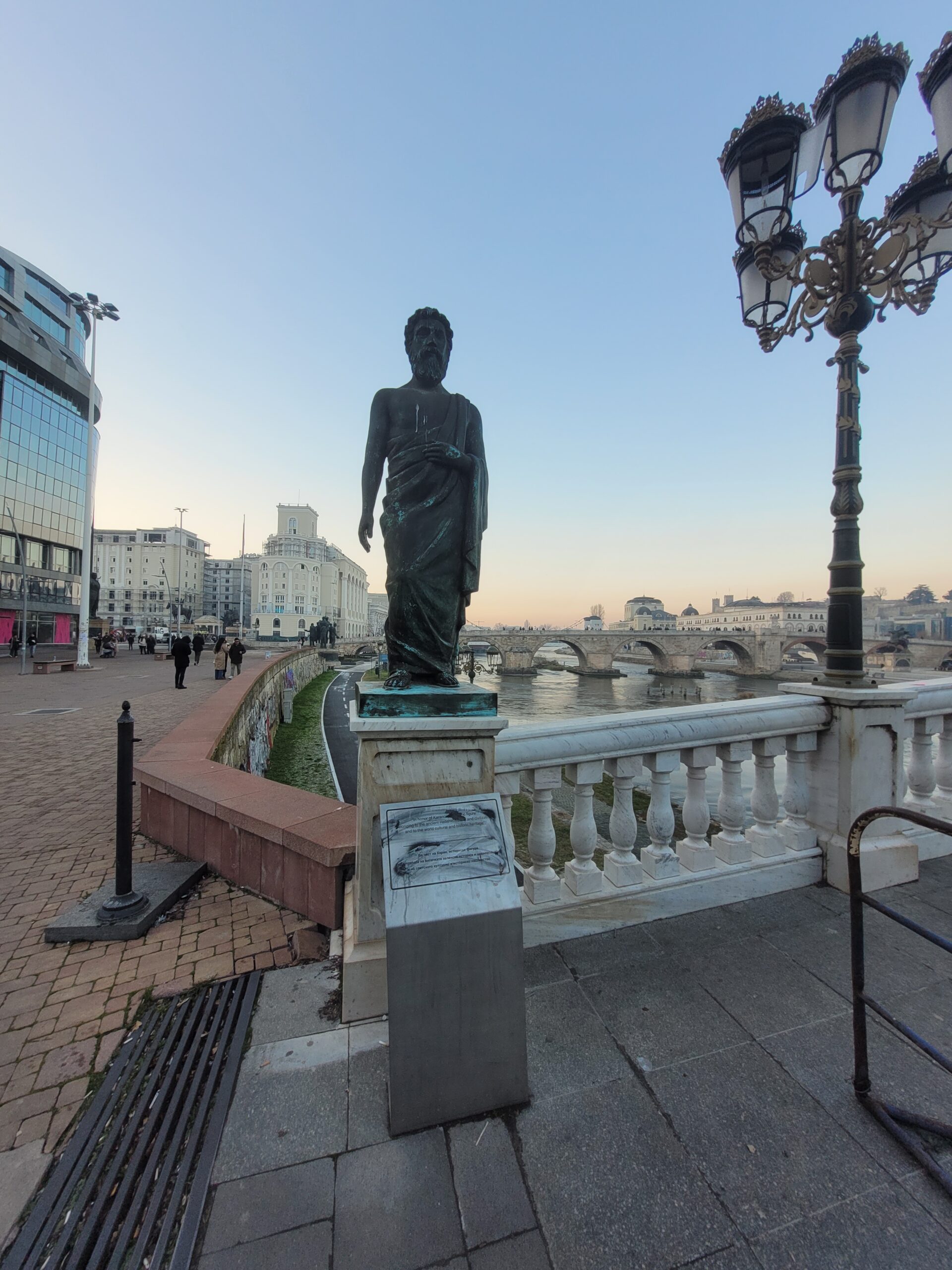 Την πρώτη ημέρα της επίσκεψης μας ο ξεναγός μας πέρασε από την κεντρική πλατεία της πόλης την πλατεία «Μακεδονίας» όπως την λένε στα Σκόπια (Φωτογραφία 1 και 2), και μας έδειξε την γέφυρα με τα αγάλματα (Φωτογραφία 3), καθώς και την πέτρινη γέφυρα που ενώνει τις δύο πλευρές του Αξιού. Δεν θα αναφερθώ στο κιτς της όλης εμφάνισης της περιοχής με τα πολλά και μεγάλα αγάλματα διαφόρων τύπων, τεχνοτροπιών, μεγεθών και υλικών κατασκευής, αλλά θα σταθώ στην σειρά των αγαλμάτων τα οποία βρίσκονται στην γέφυρα που συνδέει την μία όχθη του Αξιού με την άλλη ακριβώς μπροστά από το αρχαιολογικό μουσείο (Φωτογραφία 3). Στην γέφυρα αυτή και ξεκινώντας από την απέναντι όχθη, από εκεί που είναι κτισμένο το αρχαιολογικό μουσείο, τα αγάλματα δείχνουν την ιστορία της περιοχής. Έτσι λοιπόν έχουμε αγάλματα αρχαίων Μακεδόνων όπως του Περδίκα, του Περσέα, του Παρμενίωνα, του Αμύντα του Γ΄, του Φιλίππου του Ε΄, του Αρχελάου του Α΄, του Καράνου, και του Περδίκα του Α΄, Ακολουθούν αγάλματα διαφόρων άλλων της Ρωμαικής εποχής και όσο προχωράμε προς το αρχαιολογικό μουσείο εμφανίζονται αγάλματα νεότερων εποχών χριστιανικής και μεσαιωνικής περιόδου (Φωτογραφίες 4-11).