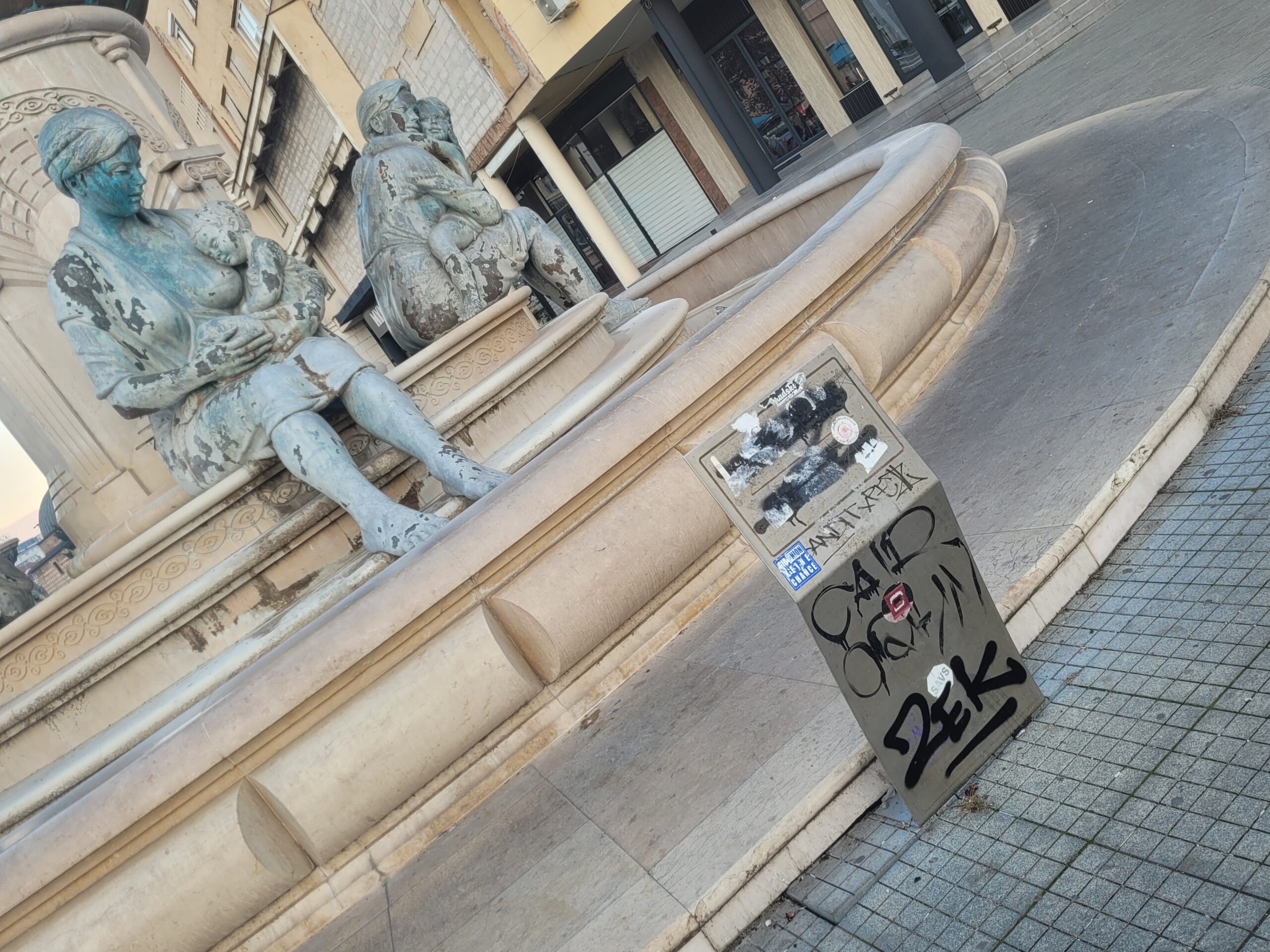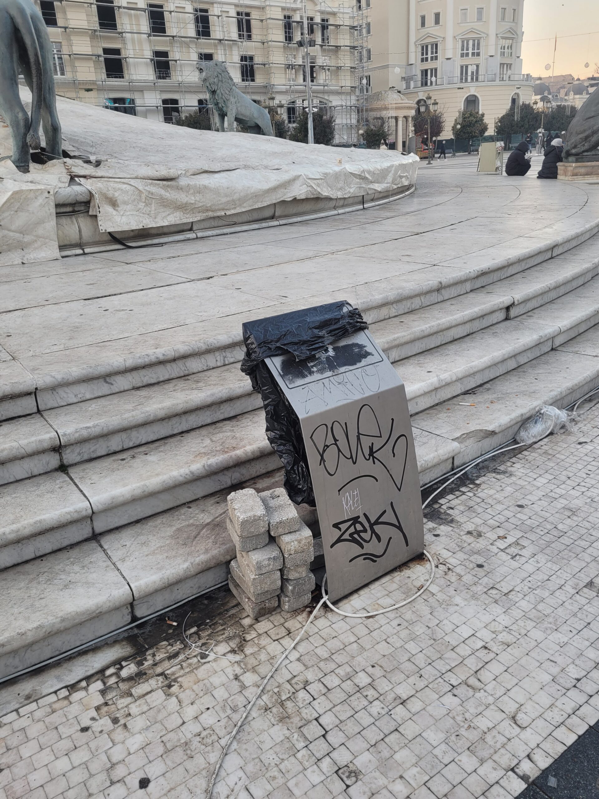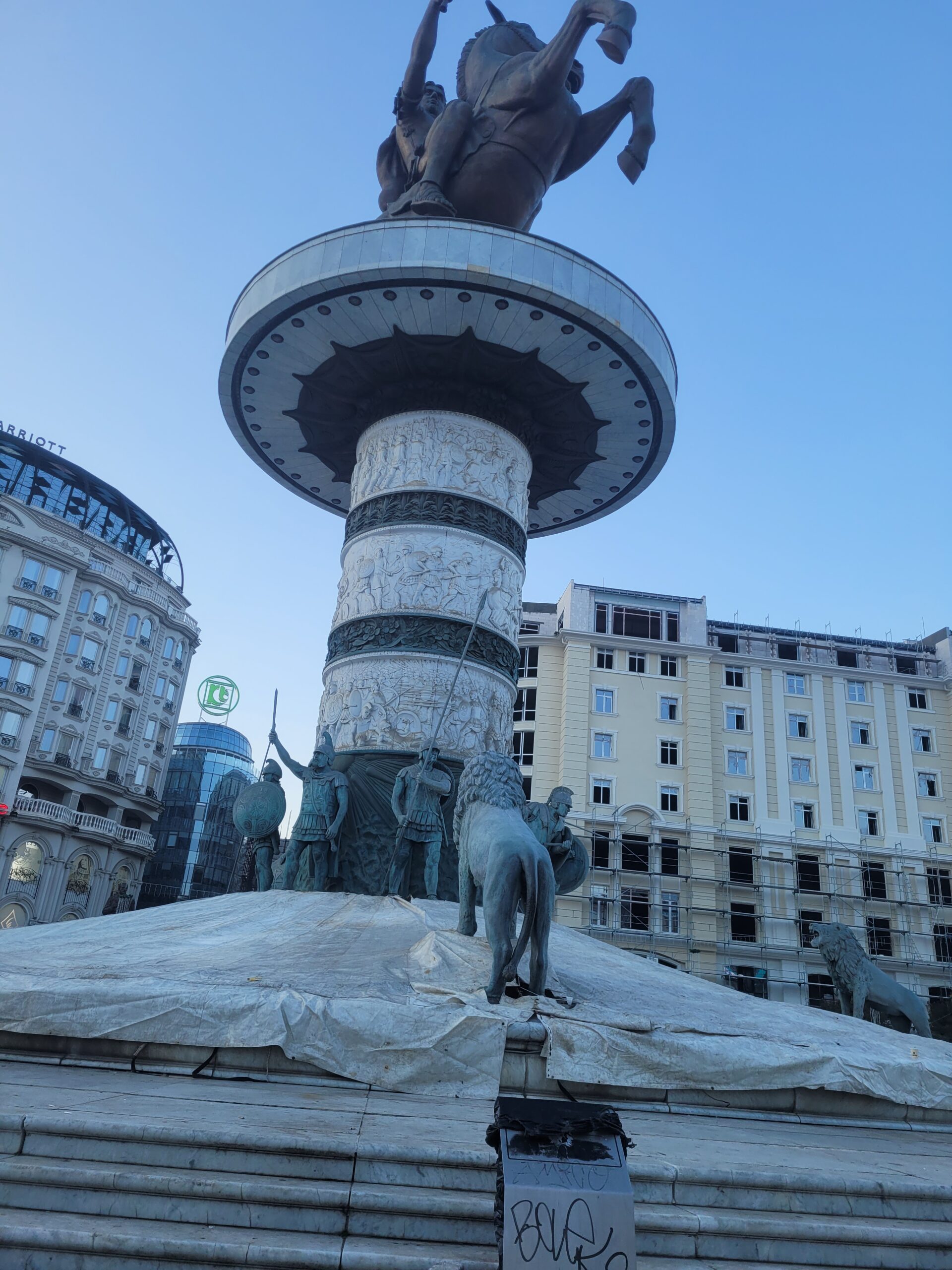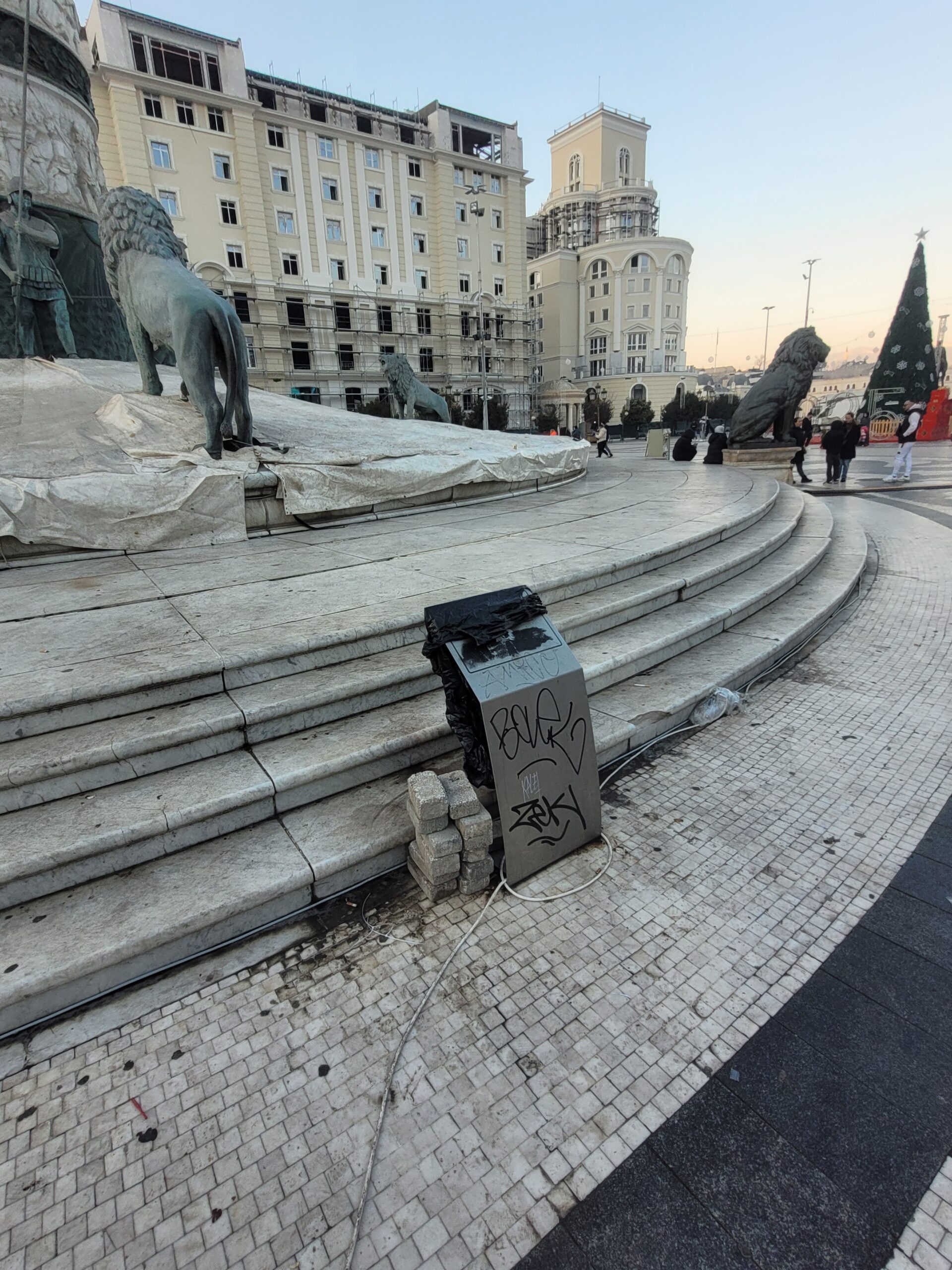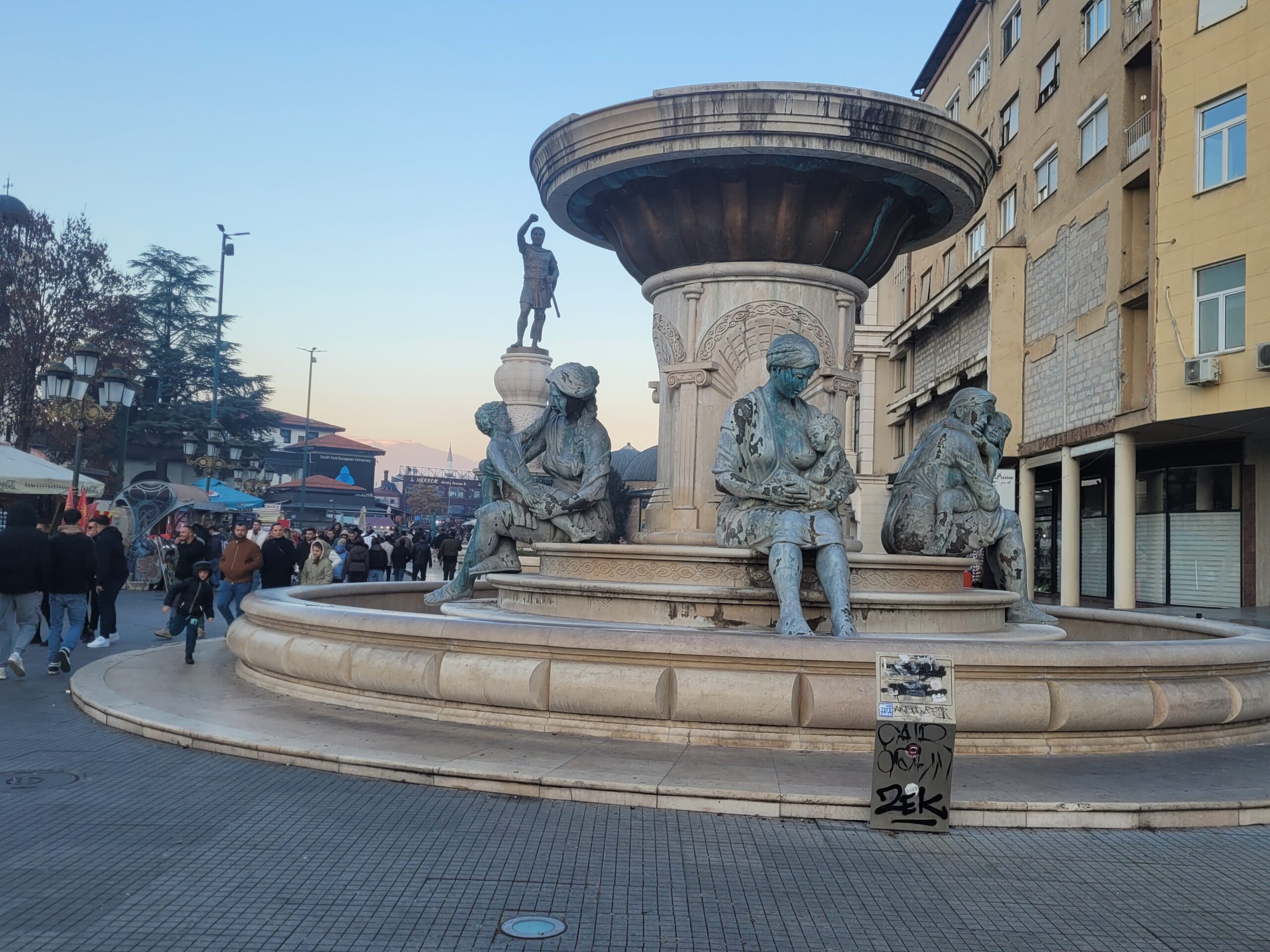 Το θέαμα που είδα ήταν απογοητευτικό, όπως φαίνεται και στις φωτογραφίες που έχω τραβήξει, και η απορία που αμμέσως μου δημιουργήθηκε είναι τι κάνει ο/η Έλληνας πρέσβης στα Σκόπια; Η πρόξενος που υπηρετεί εκεί και όλο το προσωπικό της πρεσβείας δεν τα έχουν δει αυτά; Έχουν διαμαρτυρηθεί; Ή έχουν άλλες δουλειές να κάνουν; Αυτές και άλλες πολλές απορίες πέρασαν από το μυαλό μου όταν έβλεπα αυτή την κατάσταση να επικρατεί στο κεντρικότερο σημείο των Σκοπίων και μάλιστα σε απόσταση λίγων τετραγώνων από την ελληνική πρεσβεία/ προξενείο.