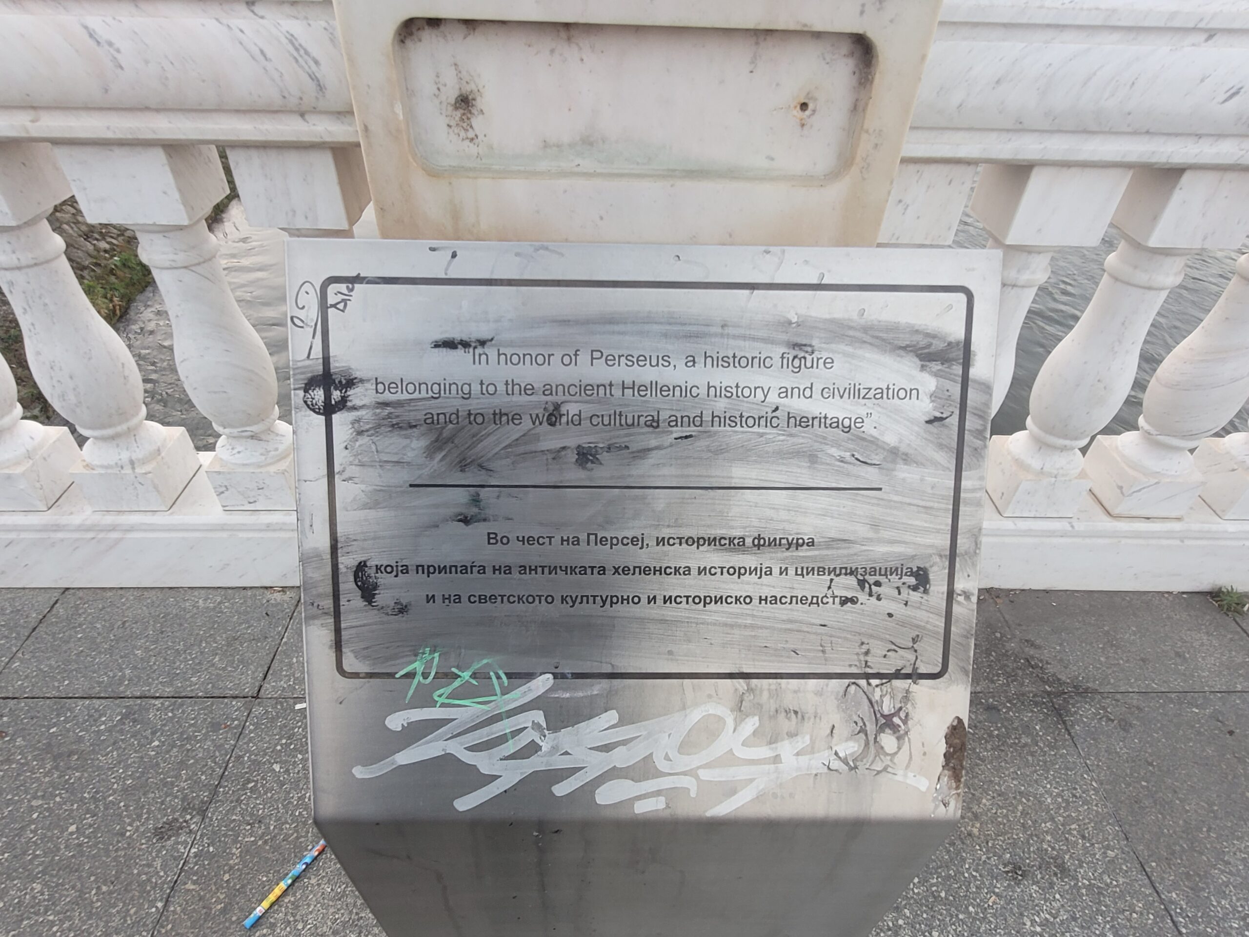 Διαπιστώσαμε αμέσως ότι στα αγάλματα που είναι της ελληνικής περιόδου έχουν τοποθετηθεί ανοξείδωτα stand στο σχήμα περίπου του αναλογίου, που στο πάνω μέρος τους είναι κεκλιμένο και έχουν χαραγμένο μικρό κείμενο στα αγγλικά και στα σλαβικά με την ιστορία του αγάλματος το οποίο συγκεκριμένα λέει «In honor of ……(π.χ. Perseus), a historic figure belonging to the ancient Hellenic history and civilization and to the world cultural and historic heritage”. [ μετάφραση: « Προς τιμήν του … (π.χ. Περσέα) ένα ιστορικό πρόσωπο που ανήκει στην αρχαία Ελληνική ιστορία και πολιτισμό, και στην παγκόσμια πολιτιστική και ιστορική κληρονομιά]. Αυτό τονίζω υπήρχε μόνο σε όλα τα αγάλματα που είχαν ελληνική προέλευση και όχι στα άλλα(Φωτογραφίες 4-11) .